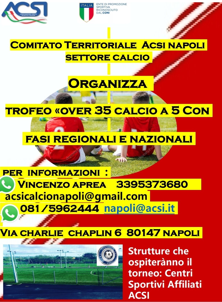 ALCIO - Il Responsabile Calcio ACSI Napoli, Enzo Aprea, presenta il "Trofeo Over35" categorie calcio a 5, calcio a 6 e calcio a 8. Il Trofeo sarà disputato con fasi Regionali e Nazionali.