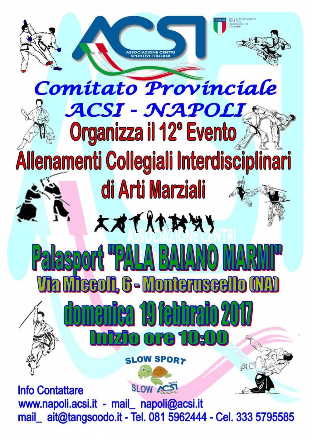 Il Comitato Provinciale ACSI Napoli ha programmato per Domenica 19 febbraio 2017 la 12^ performance sportiva di Arti Marziali definita "Allenamento collegiale interdisciplinare". Questo modo di praticare l´allenamento è una formula, che sta riscuotendo tanto successo tra i giovani sportivi.